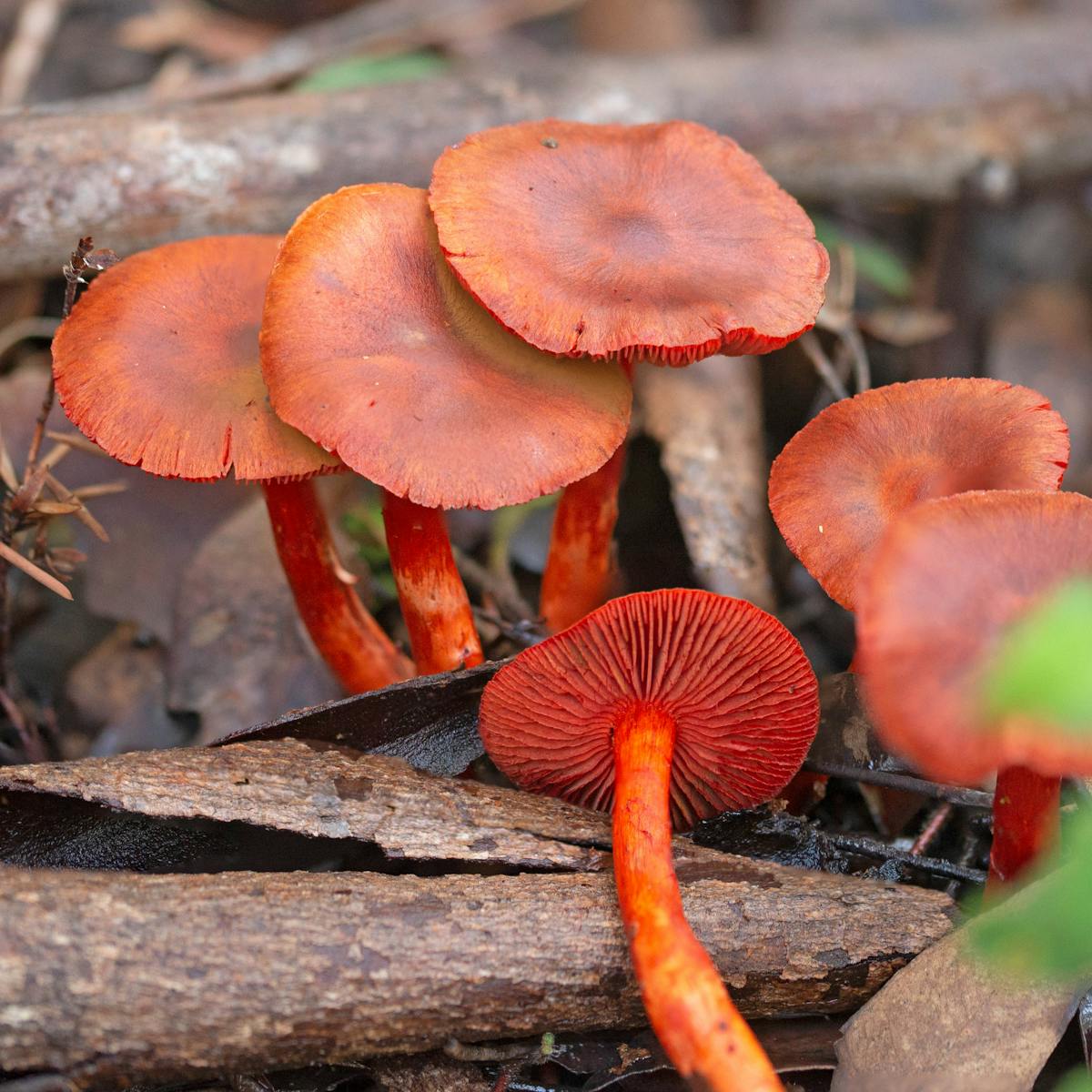 It was only the plum and apricot trees that were affected with the orange fungus. The plum tree was the worst affected with many of the main branches dotted with orange fungus. Cantharellus concinnus or pink chantarelle is an attractive but uncommon fungus that grows amongst litter in the wetter areas of eucalypt forests and woodlands and coastal.